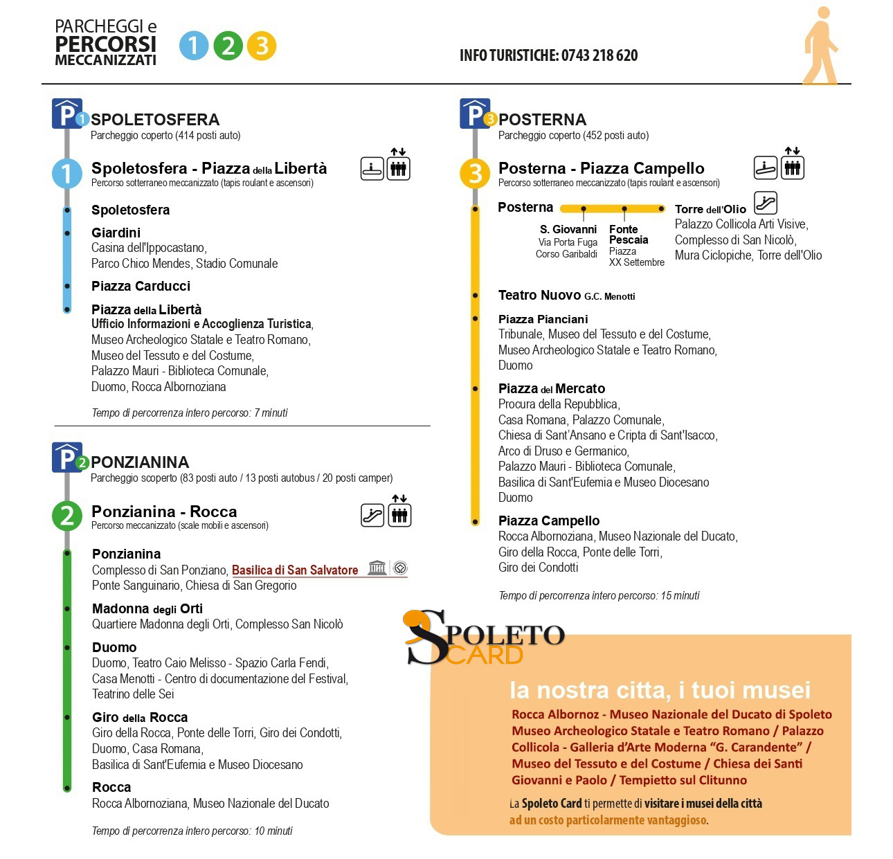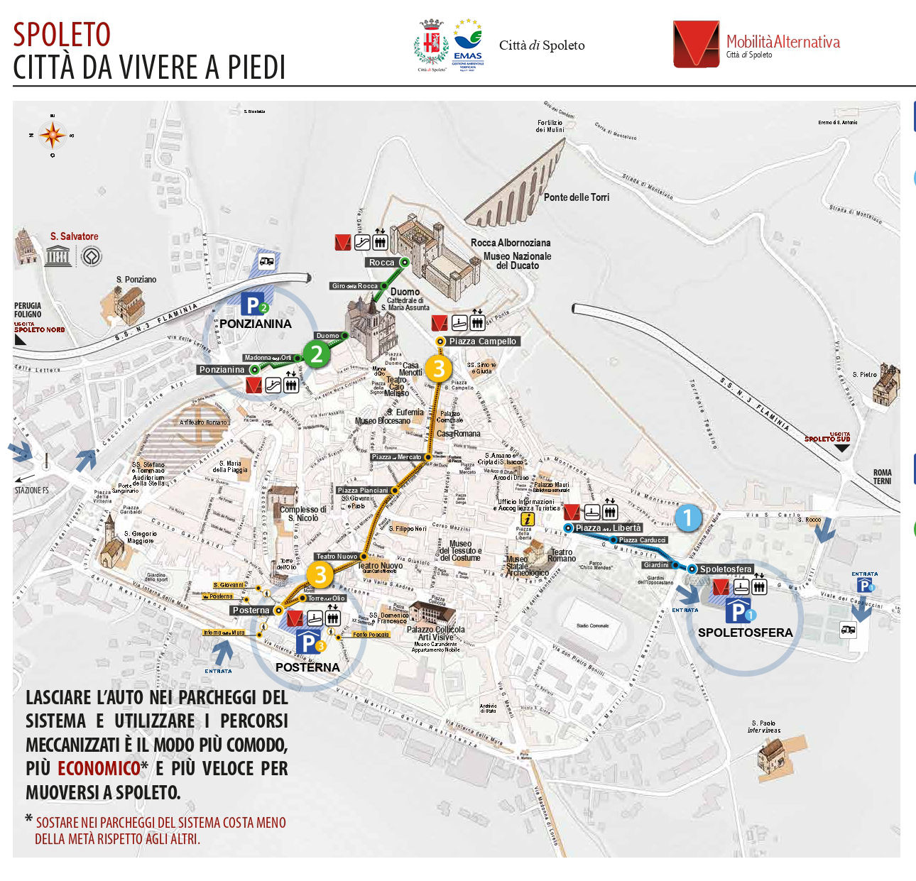 La città di Spoleto è dotata di 3 parcheggi collegati al centro storico tramite un comodo sistema di mobilità alternativa costituito da scale mobili e tapis roulant.